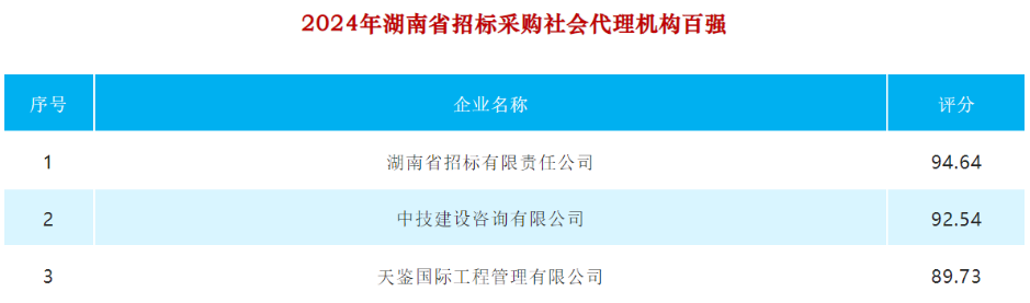 近日,2024年湖南省招標(biāo)采購社會代理機構(gòu)TOP100榜單榮耀揭曉,我司憑借在該領(lǐng)域的專業(yè)優(yōu)勢與深厚積淀再度入選,在湖南省內(nèi)參與評選的2921家代理機構(gòu)中位列第46位。這是我司繼2022年、2023年后連續(xù)第三年成功入圍“湖南省招標(biāo)采購社會代理機構(gòu)TOP100”前50名榜單。
